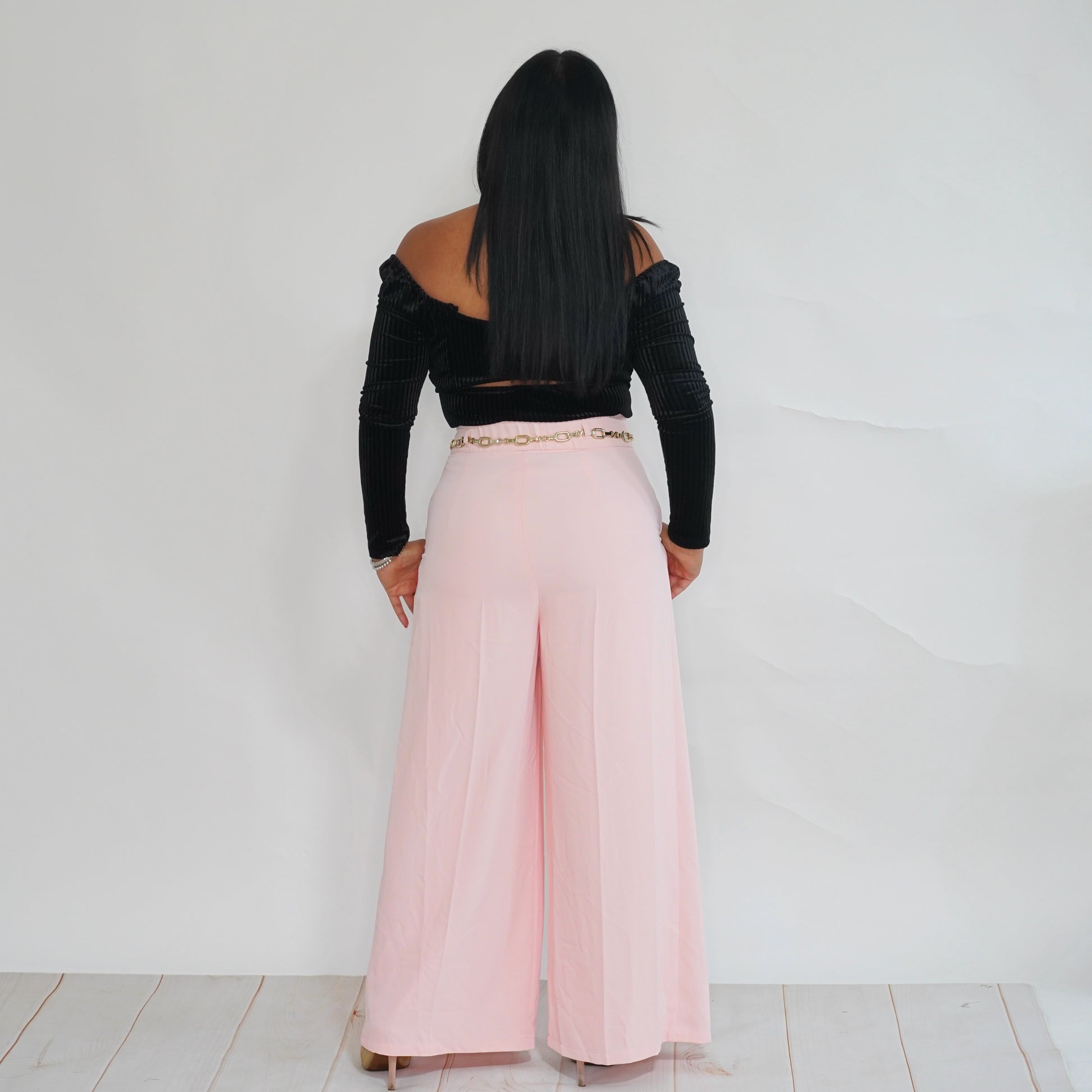 These elegant pastel pink palazzo pants offer a sophisticated and feminine touch, perfect for any occasion. Designed with a high waist and vertical pleats, they create a flattering silhouette and a graceful flow with every step. Made from a lightweight, airy fabric, they feature functional side pockets and are beautifully paired with a gold chain belt for a chic accent. Ideal to style with fitted tops or textured fabrics like velvet or ribbed knits.